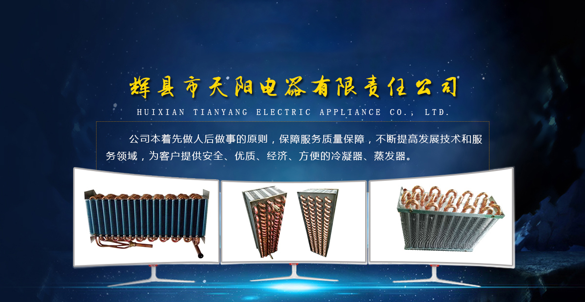 輝縣天陽電器有限責(zé)任公司位于肥沃的中原河南省輝縣市學(xué)院路中段工業(yè)集聚區(qū)興業(yè)園3號廠房,以制冷設(shè)備用冷凝器,蒸發(fā)器,熱交換器為主。主要材料為銅管鋁翅片,銅管銅翅片,鋁管鋁翅片。廣泛應(yīng)用于冰箱冰柜,制冷設(shè)備,暖通設(shè)備,空調(diào),自動售貨機,冷干機,超市立風(fēng)柜,冷藏車,烘干機等產(chǎn)品領(lǐng)域?! 」咀?998年成立以來,始終堅持:“科技造就產(chǎn)業(yè)、質(zhì)量成就信譽、誠信鑄就輝煌”的質(zhì)量方針,從產(chǎn)品拓展上堅持“人無我有,人有我優(yōu),人優(yōu)我特的”經(jīng)營理念,25年來,從1998年開始供應(yīng)河南冰熊集團下屬的冷柜廠,制冰機廠各種冷凝器;2003年之后,原冰熊集團的精英志士開始在全國各地發(fā)展,所到之處依托我公司供貨,以致于多家目前已具行業(yè)中佼佼者的公司,從而建立了如凱雪公司,兆邦公司、凌云公司、海寶公司、正雪公司、上海忠云、山東德萊維等幾十余家公司在草創(chuàng)時期的啟蒙供貨商,友好共贏長達十余年,成為我國制冷行業(yè)的供應(yīng)商。以致在2015年初雙匯集團面向社會的招標(biāo)書中指名要我公司冷凝器、蒸發(fā)器指定產(chǎn)品供應(yīng)商